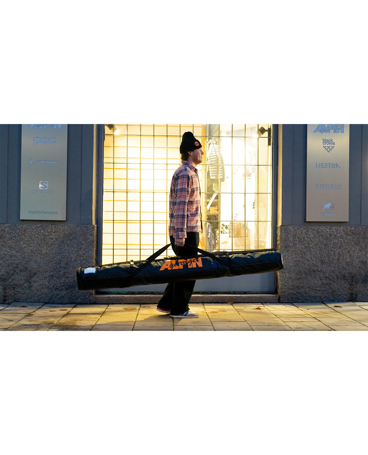 Alpingaragets skidfodral i galon är ett robust och vattenavvisande fodral som står emot slitage. Fodralet kan enkelt förlängas från 175 cm till 190 cm genom att öppna upp ena kanten. Det rymmer smidigt två par skidor och har en vadderad mittsektion för extra skydd åt bindningarna. Dessutom finns en praktisk "informationsruta" där du kan fylla i dina kontaktuppgifter. Fodralet är lätt att bära med hjälp av handtagen eller över axeln, vilket ger dig flexibilitet och bekvämlighet.
